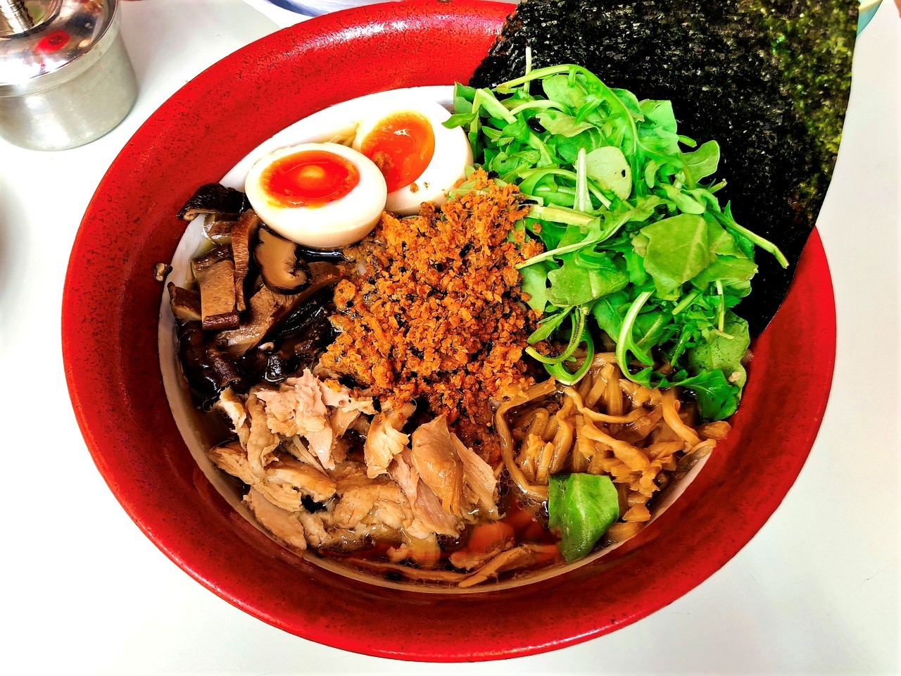 My friend had ordered the Yuzu Tonkotsu ramen, and like me, wondered how these two flavours would balance out. I can say that in the few spoons I had, the Yuzu totally outshone the Tonkotsu by far. If like us, you crave that fantastic Yuzu citrus taste, you will really enjoy this ramen. But if you are out for fatty porky bones broth with a hint of Yuzu this may not be for you. While the Tonkotsu aspect is very light, the Yuzu flavour was delightful and made for a great ramen. My friend really enjoyed her toppings too, which included bamboo shoots, chopped Chashu pork pieces, and a Clarence Court egg.